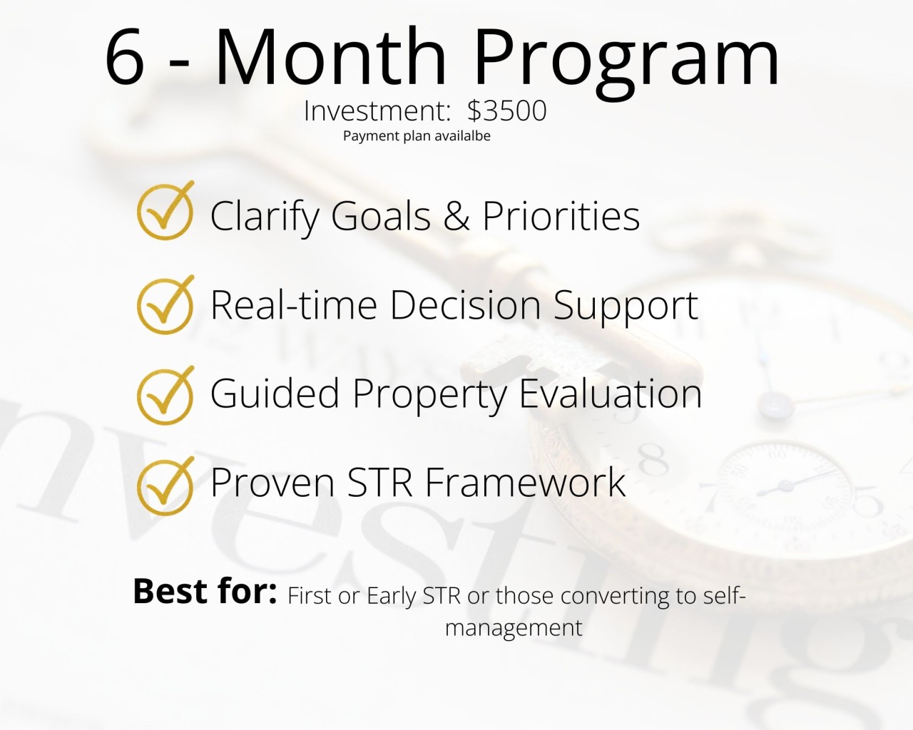 OR leverage my time and experience, fully focus on your goals for under $5K - leaving you confident, informed, and succeeding in your STR goals.. Sign up today before prices go up! I can only take on a limited number of clients, so take advantage now. I've already increased prices; I guarantee they will double in the next year in order to manage my calendar!
